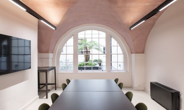 A unique, contemporary meeting area featuring the original vaulted ceilings. Looking out over the courtyard, and