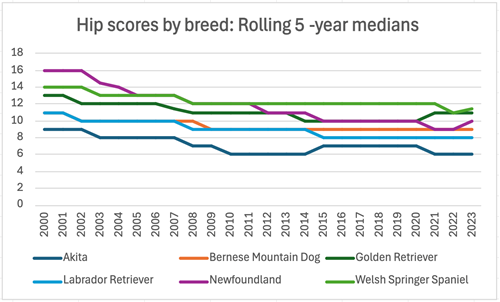 Chart showing the downward trend of rolling 5-year median hip scores in six dog breeds |