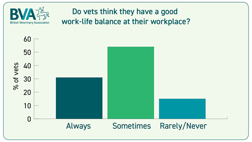 - 31% of vets believe they always have a good work-life balance at their workplace, 54% say they sometimes do, while 15% say they rarely or never do.